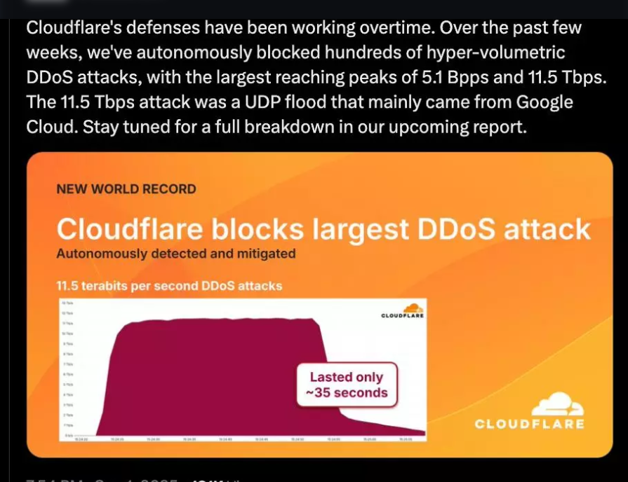 Cloudflare повідомив, що нещодавно зупинив потужну UDP-флуд атаку, яка досягла рекордного навантаження 11,5 терабіт на секунду (Tbps) та 5,1 мільярда пакетів на секунду (Bpps).